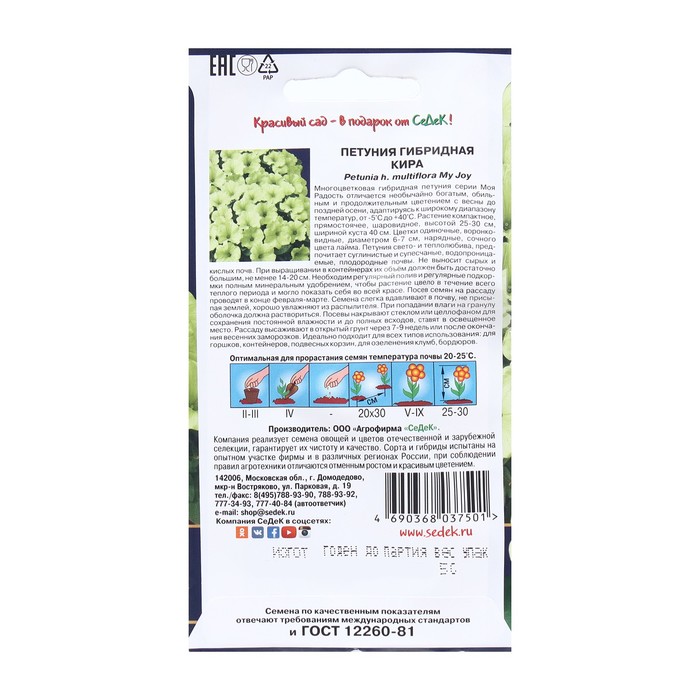 Многоцветковая гибридная петуния серии Моя Радость отличается необычайно богатым, обильным и продолжительным цветением с весны до поздней осени, адаптируясь к широкому диапазону температур, от -5C до +40C. Растение компактное, прямостоячее, шаровидное, высотой 25-30 см, шириной куста 40 см. Цветки одиночные, воронковидные, диаметром 6-7 см, нарядные, сочного цвета лайма. Петуния свето- и теплолюбива, предпочитает суглинистые и супесчаные, водопроницаемые, плодородные почвы. Не выносит сырых и кислых почв. При выращивании в контейнерах их объём должен быть достаточно большим, не менее 14-20 см. Необходим регулярный полив и регулярные подкормки полным минеральным удобрением, чтобы растение цвело в течение всего теплого периода и могло показать себя во всей красе. Посев семян на рассаду проводят в конце февраля-марте.