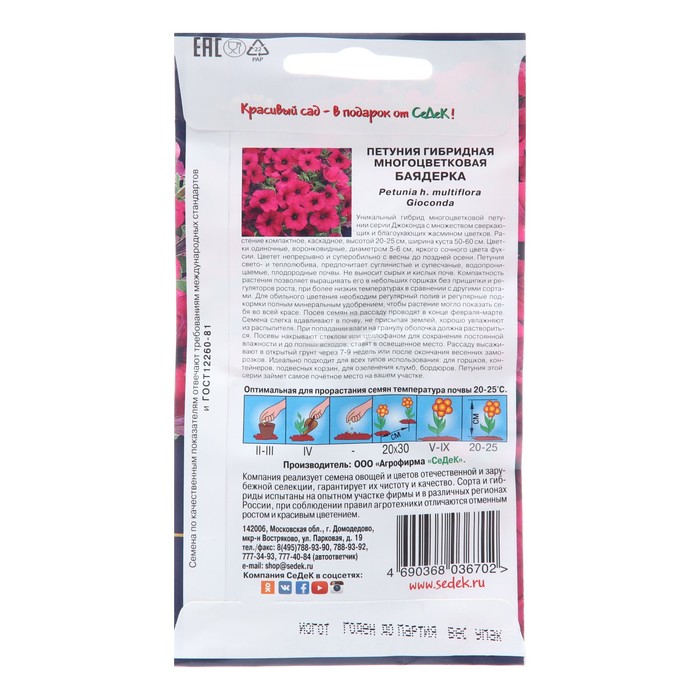 Уникальный гибрид многоцветковой петунии серии Джоконда с множеством сверкающих и благоухающих жасмином цветков. Растение компактное, каскадное, высотой 20-25 см, ширина куста 50-60 см. Цветки одиночные, воронковидные, диаметром 5-6 см, яркого сочного цвета фуксии. Цветет непрерывно и супер-обильно с весны до поздней осени. Петуния свето- и теплолюбива, предпочитает суглинистые и супесчаные, водопроницаемые, плодородные почвы. Не выносит сырых и кислых почв. Компактность растения позволяет выращивать его в небольших горшках без прищипки и регуляторов роста, при более низких температурах в сравнении с другими сортами. Для обильного цветения необходим регулярный полив и регулярные подкормки полным минеральным удобрением, чтобы растение могло показать себя во всей красе. Посев семян на рассаду проводят в конце Февраля-Марте. Семена слегка вдавливают в почву, не присыпая землей, хорошо увлажняют из распылителя. При попадании влаги на гранулу оболочка должна раствориться. Посевы накрывают стеклом или целлофаном для сохранения постоянной влажности и до полных всходов, ставят в освещенное место. Рассаду высаживают в открытый грунт через 7-9 недель или после окончания весенних заморозков. Идеально подходит для всех типов использования: для горшков, контейнеров, подвесных корзин, для озеленения клумб, бордюров. Петуния этой серии займет самое почётное место на вашем участке.Оптимальная для прорастания семян температура почвы 20-25º С.