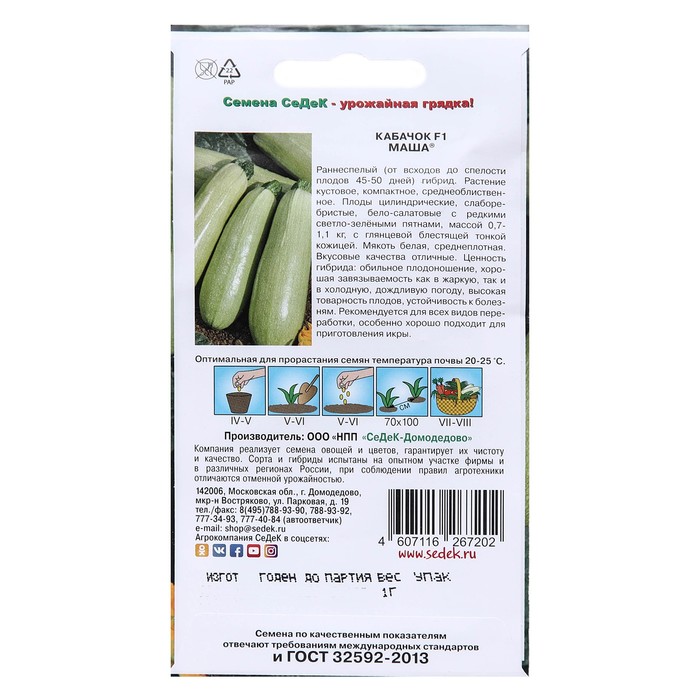 Раннеспелый (от всходов до спелости плодов 45-50 дней) гибрид. Растение кустовое, компактное, среднеоблиственное. Плоды цилиндрические, слабо- ребристые, бело-салатовые с редкими светло-зелеными пятнами, массой 0,7-1,1 кг с глянцевой блестящей тонкой кожицей. Мякоть белая, среднеплотная. Вкусовые качества отличные. Ценность гибрида: обильное плодоношение, хорошая завязываемость как в жаркую, так и вхолодную, дождливую погоду, высокая товарность плодов, устойчивость к болезням. Рекомендуется для и всех видов переработки, особенно хорошо подходит для приготовления икры.