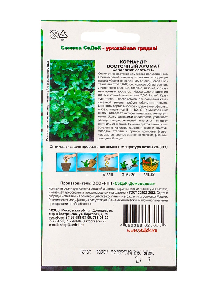 Однолетнее растение семейства Сельдерейные. Среднеспелый (период от полных всходов до начала уборки на зелень 35-45 дней) сорт. Растение высотой 50-60 см, хорошо облиственное. Листья ярко-зеленые, гладкие, нежные, с сильным пряным ароматом. Масса одного растения 30-37 г. Урожайность зелени 2,6-3,1 кг/м”. Культура тепло- и светолюбива, для получения качественной зелени требует обильного полива. Ценность сорта: высокое содержание эфирных масел, витаминов В 1, В2, С, Р, минеральных солей. Обладает антисептическими, желчегонными, болеутоляющими свойствами, усиливает работу пищеварительной системы, очищает организм от шлаков. Рекомендуется для использования в качестве салатной зелени (листья, молодые стебли) и пряной приправы (сушеные листья, зрелые семена) к мясным, рыбным, овощным блюдам.