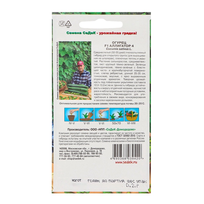 Среднеспелый (50-55 дней) пчелоопыляемый гибрид для открытого грунта (для выращивания на шпалерах), пленочных теплиц и укрытий. Растение сильнорослое, средневетвистое, лист крупный тёмно-зеленый. Зеленцы цилиндрические, тёмно-зелёные с блестящей часто- и крупнобугорчатой поверхностью, слегка ребристые, длиной 25-35 см, тонкокожие, вкусные, с ярко выраженным огуречным ароматом. Товарная урожайность под плёночными укрытиями составила 12,0-13,0 кг/кв.м. Ценность гибрида: устойчивость к вирусу огуречной мозаики, мучнистой росе и неблагоприятным погодным условиям, жаростойкость. Рекомендуется для употребления в свежем виде, консервирования и засолки нарезанными дольками.