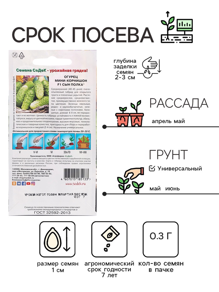 Среднеранний (40-45 дней) пчелоопыляемый гибрид для открытого грунта и пленочных укрытий. Растение среднерослое, средневетвистое, преимущественно женского типа цветения. Зеленцы овальные, редко- и крупнобугорчатые, зеленые с короткими полосками, белошипые, длиной 6-8 см, не перерастают и не желтеют. Ценность гибрида: устойчивость к ложной мучнистой росе, вирусу огуречной мозаики, парше тыквенных культур, обильное и продолжительное плодоношение, высокие вкусовые, технологические и товарные качества, пригодность для сбора и переработки корнишонов и пикулей (2-4 см). Назначение универсальное.
