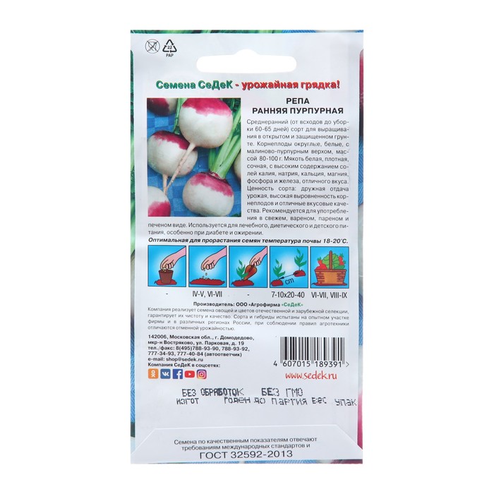 Среднеранний (от всходов до уборки 60-65 дней) сорт. Розетка высокорослая. Корнеплоды округлые, белые с малиново-пурпурным верхом, массой 80-100 г. Мякоть белая, плотная, сочная, отличного вкуса. Дружная отдача урожая. Высокая выравненность корнеплодов и отличные вкусовые качества. Рекомендуется для употребления в свежем, варёном, пареном и печёном виде. Урожайность 30-40 т/га.