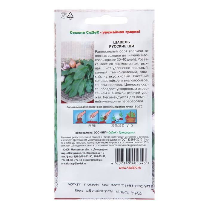 Раннеспелый сорт (период от полных всходов до начала массовой срезки 30-40 дней). Розетка листьев прямостоячая, рыхлая. Лист удлиненно-овальный, сочный, темно-зеленый, гладкий, на вкус кислый. Растение холодостойкое и влаголюбивое, теневыносливое. Ценность сорта: обладает ускоренным отрастанием и высокой отдачей урожая. Рекомендуется для домашней кулинарии и переработки.