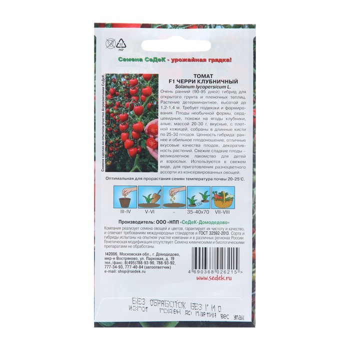 Очень ранний (90-95 дней) гибрид для открытого грунта и пленочных теплиц. Растение детерминантное, высотой до 1,2-1,4 м. Требует подвязки и формирования. Плоды необычной формы, сердцевидные, похожи на ягоды клубники, алые, массой 20-30 г, вкусные, с плотной кожицей, собраны в длинные кисти по 25-30 плодов. Ценность гибрида: раннее и обильное плодоношение, отличные вкусовые качества плодов, декоративность растений. Свежие сладкие плоды – великолепное лакомство для детей и взрослых. Используются в свежем виде, для приготовления разноцветного ассорти из консервированных овощей.