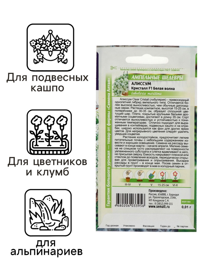 Ампельный сильнорослый гибрид алиссума с высокой интенсивностью цветения. Не перерастает и не вытягивается. Выдерживает заморозки до -5°С и временное выпадение снежного покрова. Обладает насыщенным ароматом. Подходит для контейнерного выращивания и размещения в открытом грунте. Длина плети: 15-25 см Диаметр цветка: 0,8-1,0 см Условия выращивания, место посадки: хорошо освещенные места Требования к грунту: питательный легкий грунт с нейтральной кислотностью Способы выращивания: рассадный Время посева на рассаду: март-апрель Способ посева: семена распределить на уплотненный грунт или торфяную таблетку не заделывая, лишь слегка вдавливая. Хорошо увлажнить и накрыть пленкой. Для проращивания посевы помещают в теплое место (+22-25°С). Для предотвращения вытягивания емкость с посева рекомендуется разместить под фитолампой на высоте 8-10 см. Время до появления всходов:15-18 дней Перевалка: производится в стадии 2-3 настоящих листьев в рассадные емкости диаметром около 9 см, около 5-7 недели после посева. Последующие перевалки осуществляются по мере роста корневой системы. Для подвесного кашпо используются емкости не менее 30 см в диаметре. После перевалки требуется притенить растения на 2-3 дня Время высадки в открытый грунт, корзины: май-июнь Посадочное расстояние: 15-20 см Период цветения: май-октябрь Уход: полив на ранних этапах развития растений следует производить очень аккуратно, чтобы не повредить всходы. Для более обильного и длительного цветения в начале бутонизации подкармливают фосфорно-калийным удобрением, далее повторяют подкормки 1 раз в неделю. Во второй половине лета для стимулирования второй волны цветения допускается проведение омолаживающей стрижки. Внимание! Семена коатированные, оболочку не разрушать, она растворяется при поливе