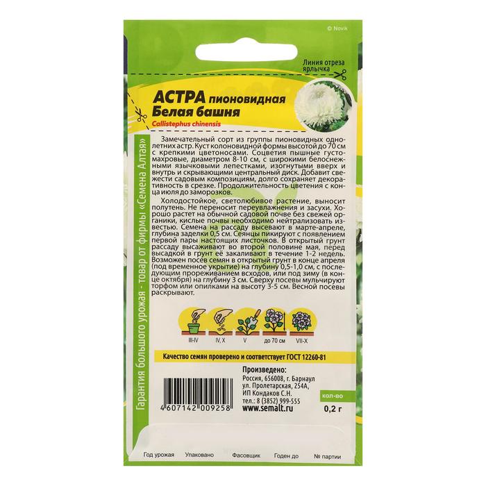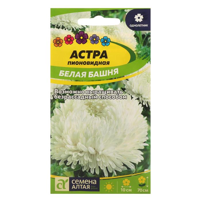 Замечательный сорт из группы пионовидных однолетних астр. Куст колоновидной формы высотой до 70 см с крепкими цветоносами. Соцветия пышные густомахровые, диаметром 8-10 см, с широкими белоснежными язычковыми лепестками, изогнутыми вверх и внутрь и скрывающими центральный диск. Добавит свежести садовым композициям, долго сохраняет декоративность в срезке. Продолжительность цветения с конца июля до заморозков. Холодостойкое, светолюбивое растение, может расти в полутени. Не выносит переувлажнения и засухи. Хорошо растет на обычной садовой почве без свежей органики, кислые почвы необходимо нейтрализовать известью. Семена на рассаду высевают в марте-апреле, глубина заделки 0,5 см. Посевы содержат при температуре +15-18°С. Сеянцы пикируют с появлением первой пары настоящих листочков. В открытый грунт рассаду высаживают во второй половине мая. Перед высадкой в открытый грунт её закаливают в течение 1-2 недель, снизив температуру до +10°С. Схема посадки 3030 см. Возможен посев семян в открытый грунт в конце апреля под временное укрытие на глубину 0,5-1,0 см (с последующим прореживанием всходов), или под зиму (в конце октября) на глубину 3 см. Сверху посевы мульчируют торфом или опилками слоем 3-5 см. Весной посевы раскрывают.
