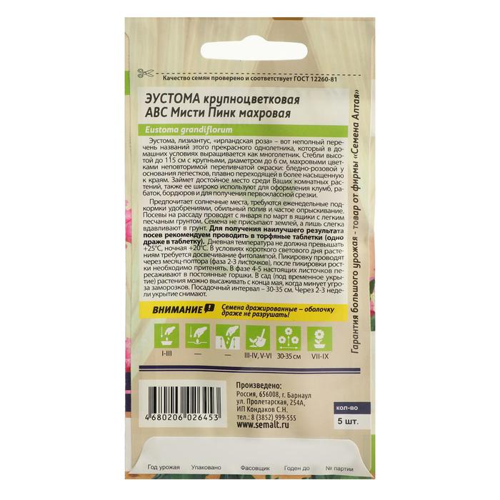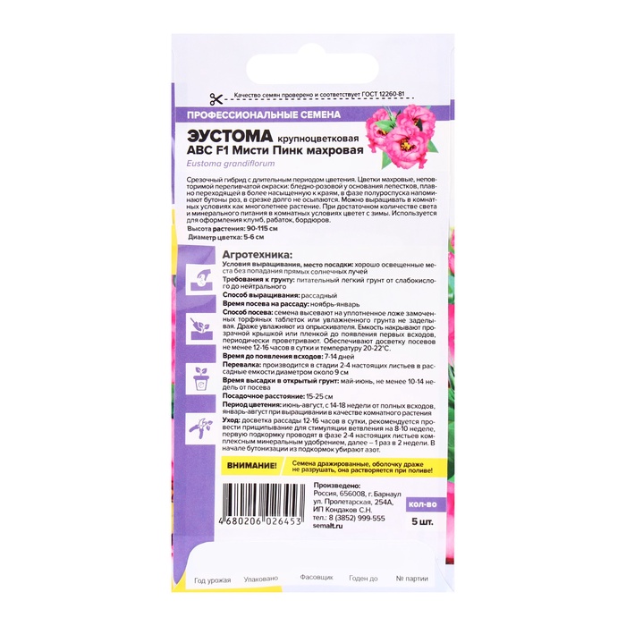 Эустома, лизиантус, «ирландская роза» — вот неполный перечень названий этого прекрасного однолетника, который в домашних условиях выращивается как многолетник. Полураспустившиеся цветки похожи на бутоны роз. Стебли высотой до 115 см с крупными махровыми цветками, диаметром до 6 см. Займет достойное место среди Ваших комнатных растений, также ее широко используют для оформления клумб, рабаток, бордюров и для получения первоклассной срезки. Предпочитает солнечные места, требуются еженедельные подкормки удобрениями, обильный полив и частое опрыскивание. Посев на рассаду с января по март в ящики с легким песчаным грунтом. Семена не присыпают землей, а слегка вдавливают в грунт. Дневная температура не должна превышать 25°С, ночная 20°С. Пикировку проводят через месяц-полтора, затем ростки необходимо притенять. В фазе 4-5 настоящих листочков пересаживают в постоянные горшки. Высадка рассады в открытый грунт под укрытие в конце мая —начале июня. Через 2-3 недели укрытие снимают.