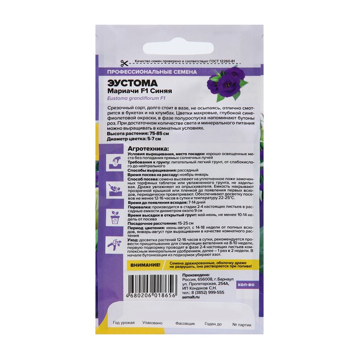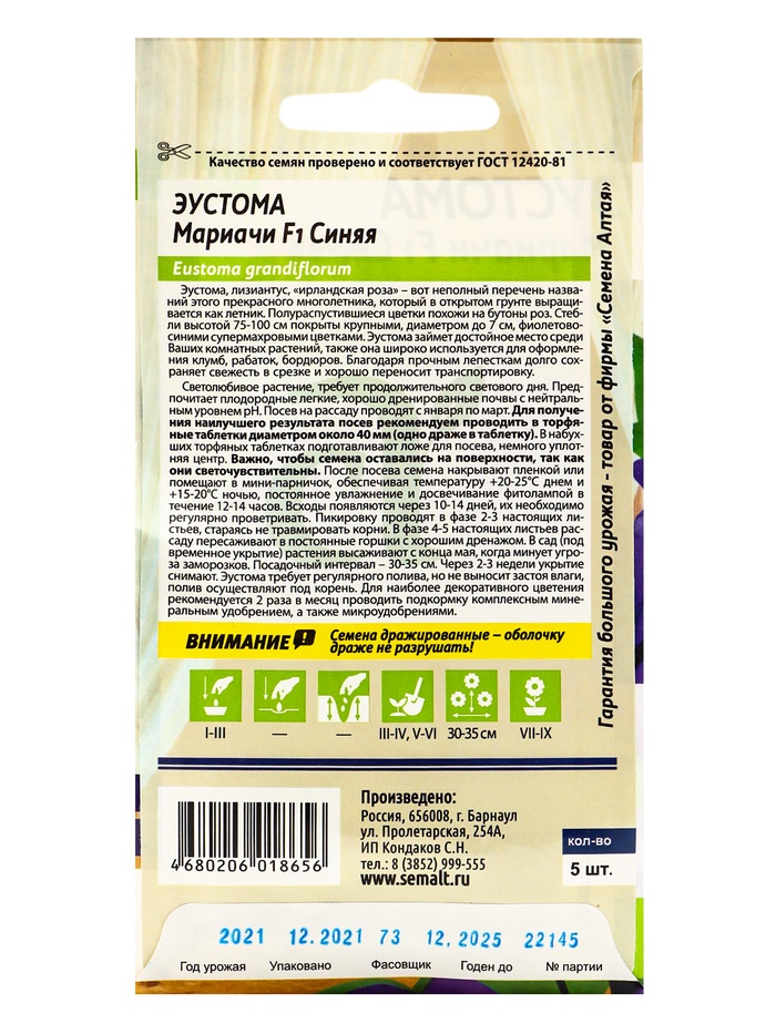 Эустома, лизиантус, «ирландская роза» — вот неполный перечень названий этого прекрасного однолетника, который в домашних условиях выращивается как многолетник. Полураспустившиеся цветки похожи на бутоны роз. Стебли высотой до 100 см покрыты крупными, диаметром до 7 см, сине-фиолетовыми супермахровыми цветками. Займет достойное место среди Ваших комнатных растений, также ее широко используют для оформления клумб, рабаток, бордюров. Предпочитает солнечные места, требуются еженедельные подкормки удобрениями, обильный полив и частое опрыскивание.