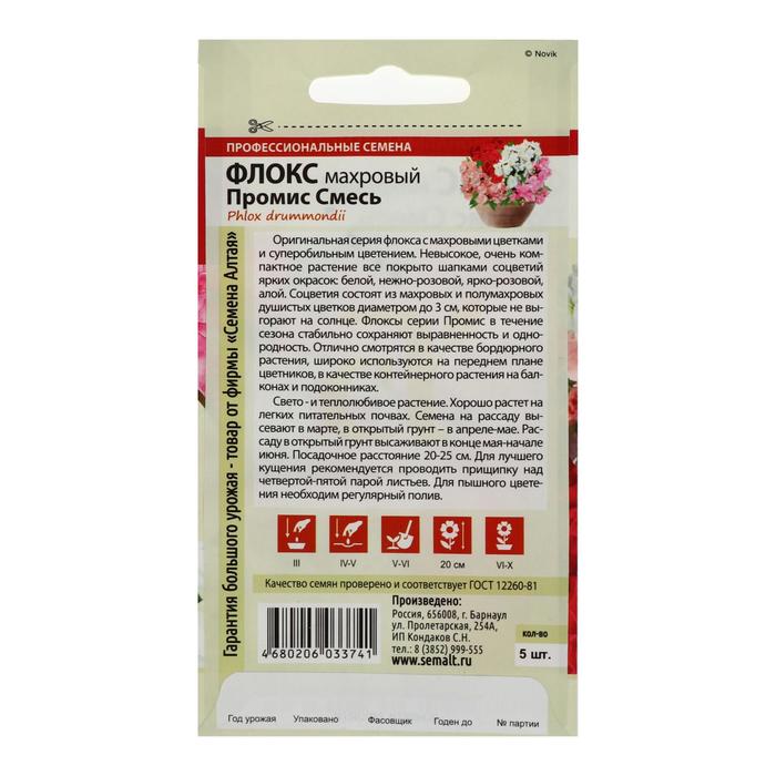 Оригинальная серия флокса с махровыми цветками и суперобильным цветением. Невысокое, очень компактное растение все покрыто шапками соцветий ярких окрасок: белой, нежно-розовой, ярко-розовой, алой. Соцветия состоят из махровых и полумахровых душистых цветков диаметром до 3 см, которые не выгорают на солнце. Флоксы серии Промис в течение сезона стабильно сохраняют выравненность и однородность. Отлично смотрятся в качестве бордюрного растения, широко используются на переднем плане цветников, в качестве контейнерного растения на балконах и подоконниках. Свето- и теплолюбивое растение. Хорошо растет на легких питательных почвах.