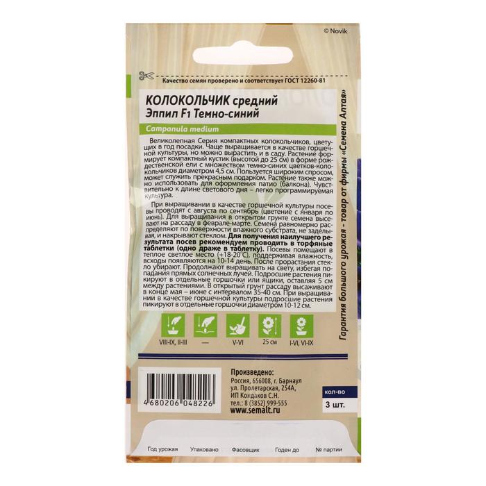 Великолепная Серия компактных колокольчиков, цветущих в год посадки. Чаще выращивается в качестве горшечной культуры, но можно вырастить и в саду. Растение формирует компактный кустик (высотой до 25 см) в форме рождественской ели с множеством темно-синих цветков-колокольчиков диаметром 4,5 см. Пользуется широким спросом, может служить прекрасным подарком. Растение также можно использовать для оформления патио (балкона). Чувствительно к длине светового дня - легко программируемая культура.При выращивании в качестве горшечной культуры посевы проводят с августа по сентябрь (цветение с января по июнь). Для выращивания в открытом грунте семена высевают на рассаду в феврале-марте. Семена равномерно распределяют по поверхности влажного субстрата, не заделывая, и накрывают стеклом. Для получения наилучшего результата посев рекомендуем проводить в торфяные таблетки (одно драже в таблетку). Посевы помещают в теплое светлое место (+18-20°С), поддерживая влажность, всходы появляются на 10-14 день. После прорастания стекло убирают. Продолжают выращивать на свету, избегая попадания прямых солнечных лучей. Подросшие растения пикируют в отдельные горшочки или ящики, оставляя 5 см между растениями. В открытый грунт рассаду высаживают в конце мая - июне с интервалом 35-40 см. При выращивании в качестве горшечной культуры подросшие растения пикируют в отдельные горшочки диаметром 10-12 см.