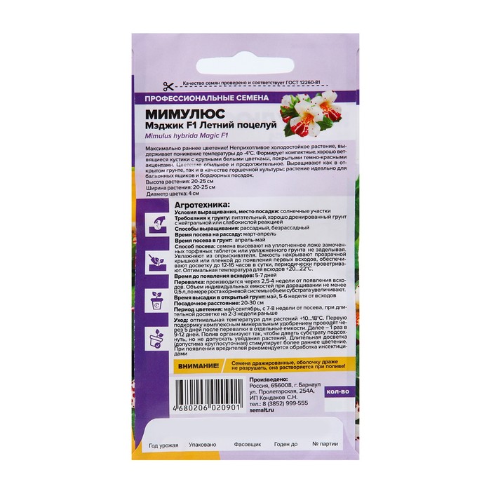 Привлекательное быстрорастущее растение. Выращивают как в открытом грунте, так и в качестве горшечной культуры. Формирует компактный куст высотой и шириной 20-25 см, стебли прямостоячие, ветвистые. Листья яйцевидные, по краю зазубренные. Крупные, до 4 см диаметром, белые цветки покрыты крупными красными и темно-коричневыми пятнышками, что придает растению задорный вид. Серию Мэджик отличает короткий период выращивания (всего 7 недель от посева до начала бутонизации), пышное обильное цветение, а также способность растений выдерживать небольшие заморозки до -4оС. Тепло- и влаголюбивое растение, не выносит палящих солнечных лучей. Предпочитает полутенистые, защищенные от ветров участки на слабокислых рыхлых суглинистых почвах с повышенной влажностью. Посевы на рассаду проводят в конце марта – начале апреля. В качестве субстрата лучше использовать универсальный грунт с кокосовым волокном и перлитом, добавив немного чистого песка. Семена распределяют по поверхности субстрата, не заделывая, и слегка опрыскивают водой комнатной температуры. Емкость накрывают стеклом. Температура в помещении должна быть не менее +18°С. Ежедневно стекло убирают для проветривания посевов. Первые ростки появляются через 4-8 дней, укрытие снимают и помещают емкость в хорошо освещенное прохладное место (+10-12°С), избегая попадания прямых солнечных лучей. Грунт постоянно должен быть умеренно влажным. В стадии 3-х настоящих листьев сеянцы пикируют в отдельные торфяные горшочки. В грунт рассаду высаживают в конце мая вместе с горшочками. Посадочный интервал – 20-25 см. Первая волна цветения в июне-июле, затем растения необходимо обрезать. Вторая волна цветения, как правило, обильнее и продолжительнее первой. Возможно сохранение растений в зимний период в комнатных условиях.