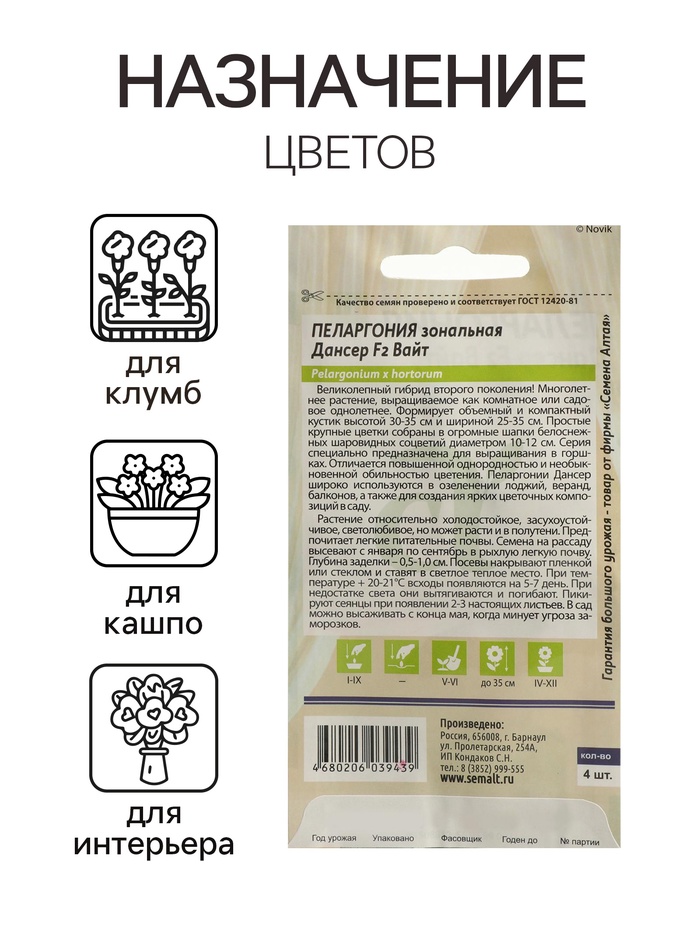 Великолепный гибрид второго поколения! Многолетнее растение, выращиваемое как комнатное или садовое однолетнее. Формирует объемный и компактный кустик высотой 30-35 см и шириной 25-35 см. Простые крупные цветки собраны в огромные шапки белоснежной окраски шаровидных соцветий диаметром 10-12 см. Серия специально предназначена для выращивания в горшках. Отличается повышенной однородностью и необыкновенной обильностью цветения. Пеларгонии Дансер широко используются в озеленении лоджий, веранд, балконов, а также для создания ярких цветочных композиций в саду.