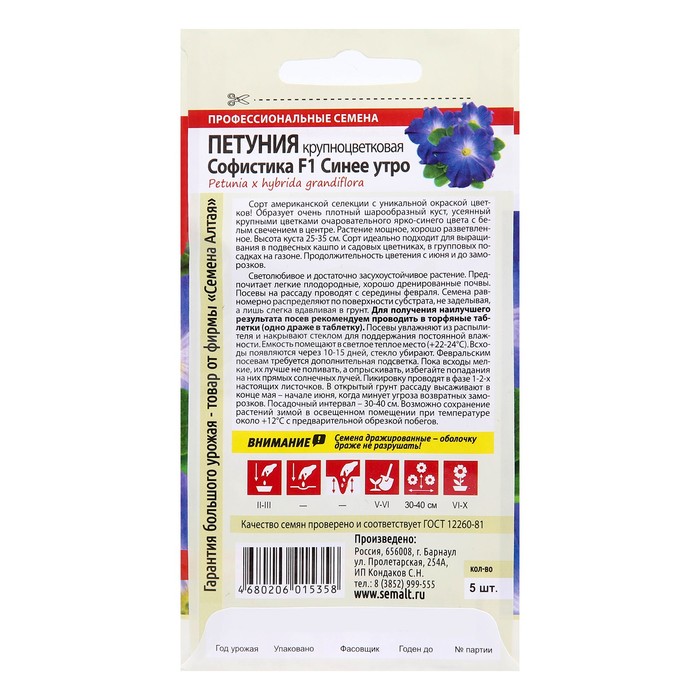 Сорт американской селекции с уникальной окраской цветков! Образует очень плотный шарообразный куст, усеянный крупными цветками очаровательного ярко-синего цвета с белым свечением в центре. Растение мощное, хорошо разветвленное. Высота куста 25-35см. Сорт идеально подходит для выращивания в подвесных кашпо и садовых цветниках, в групповых посадках на газоне. Продолжительность цветения с июня и до заморозков.Светолюбивое и достаточно засухоустойчивое растение. Предпочитает легкие плодородные, хорошо дренированные почвы. Посевы на рассаду проводят с середины февраля. Семена равномерно распределяют по поверхности субстрата, не заделывая, а лишь слегка вдавливая в грунт. Для получения наилучшего результата посев рекомендуем проводить в торфяные таблетки (одно драже в таблетку). Посевы увлажняют из распылителя и накрывают стеклом для поддержания постоянной влажности. Емкость помещают в светлое теплое место (+22-24°С). Всходы появляются через 10-15 дней, стекло убирают. Февральским посевам требуется дополнительная подсветка. Пока всходы мелкие, их лучше не поливать, а опрыскивать, избегайте попадания на них прямых солнечных лучей. Пикировку проводят в фазе 1-2-х настоящих листочков. В открытый грунт рассаду высаживают в конце мая - начале июня, когда минует угроза возвратных заморозков. Посадочный интервал – 30-40 см. Возможно сохранение растений зимой в освещенном помещении при температуре около +12°С с предварительной обрезкой побегов. Внимание! Семена дражированные - оболочку драже не разрушать!