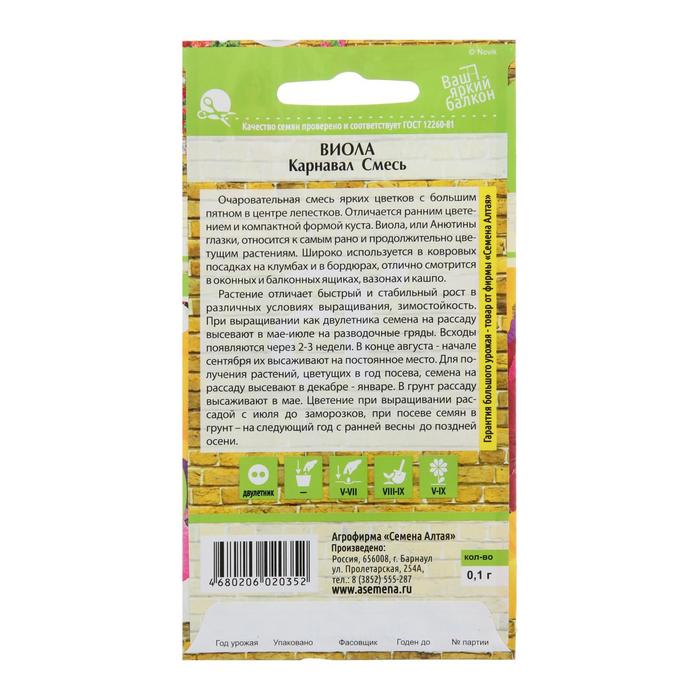 Очаровательная смесь ярких цветков с большим пятном. Смесь отличается ранним цветением и компактной формой куста. Виола, или Анютины глазки, относятся ксамым рано и продолжительно цветущим растениям. Широко используется в ковровых посадках на клумбах и в бордюрах, отлично смотрится в оконных и балконных ящиках, вазонах и кашпо.Неприхотливое, зимостойкое растение, предпочитает открытые солнечные участки, но может расти в полутени. Хорошо развивается на почвах, состоящих из торфа, перегноя и дерновой земли с добавлением песка. При выращивании как двулетника, семена на рассаду высевают в мае-июле на разводочные гряды. В конце августа - начале сентября подросшие сеянцы высаживают на постоянное место. Для получения растений, цветущих в год посева, семена на рассаду высевают с последней декады февраля. В субстрате делают бороздки глубиной 3-5 мм, интервал между бороздками - 1 см. Семена раскладывают с интервалом 2 см и присыпают почвой. Посевы увлажняют, накрывают стеклом и помещают в тёплое светлое место с температурой +20-25оС. Стекло периодически снимают для проветривания. Всходы появляются через 7-10 дней. В первые дни проводят проветривания 2 раза в сутки по 20-30 минут, постепенно увеличивая временной интервал, полностью укрытие снимают через неделю. При образовании двух настоящих листиков проводят пикировку. В открытый грунт рассаду высаживают в конце мая - июне. Посадочный интервал 15-20 см. Цветение при выращивании рассадой с июля до заморозков, при посеве семян в грунт – на следующий год с ранней весны и до поздней осени.
