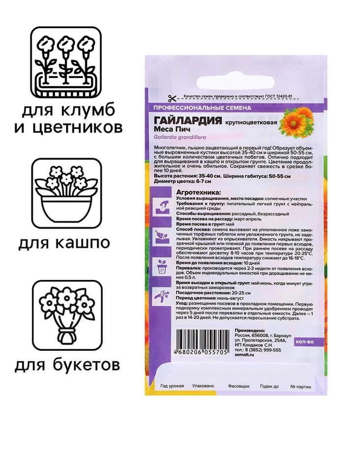 Многолетнее декоративное растение, зацветающее в первый год.Компактный габитус, хорошее ветвление. Цветение ранее. Формирует множество крупных соцветий ярких окрасок. Растение устойчиво к жаре, не тускнеет на протяжении всего периода цветения. Гайлардии отлично смотрятся в одиночных и комбинированных посадках на клумбах, цветниках, рабатках и контейнерах. Окраска Пич зацветает раньше остальных в этой серии и на 10 см ниже.