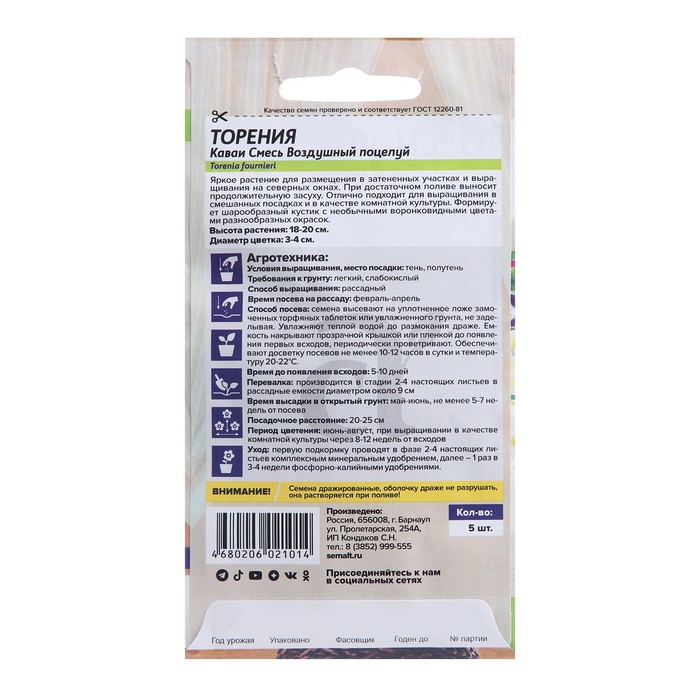 Изящное однолетнее комнатное растение. Ценится за обильное и продолжительное цветение, красоту цветков, компактность кустика и быстрое развитие. Растение формирует низкие сильноветвистые кустики, высотой до 20 см, усыпанные яркими цветками оригинальной формы и необычной окраски: синей, лиловой, розовой, белой с желтыми пятнышками. Обильноцветущая торения хорошо сочетается с ампельными растениями в подвесных корзинах, балконных ящиках и высоких вазонах. Растение теплолюбивое, любит яркий рассеянный свет и защищенные от ветров и дождей участки. Не выносит застоя влаги.
