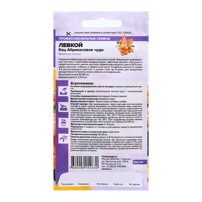 Неприхотливый сорт для срезки и высоких клумб. Формирует выравненные кустики с короткими междоузлиями. Цветение раннее, обильное и продолжительное, цветки крупные, абрикосово-медного цвета (50% махровых цветков), собраны в эффектные кисти. Соцветия срезают в стадии 3-5 распустившихся цветков, в срезке стоят до 8 дней, для продления декоративности букеты можно убирать в холодильник. Высота растения: 60-80 см Диаметр цветка: 2,5-3 см Условия выращивания, место посадки: хорошо освещенные места Требования к грунту: питательный легкий грунт с нейтральной реакцией Способы выращивания: рассадный, безрассадный Время посева на рассаду: февраль-март Время посева в грунт: апрель-май, октябрь-ноябрь.