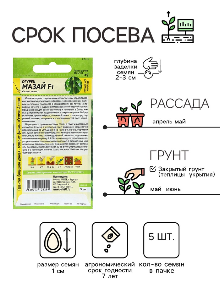 Один из первых современных отечественных короткоплодных партенокарпических гибридов с одновременным наливом нескольких плодов (до 6-8) на растении без потери их товарных качеств, и с дружной массированной отдачей урожая. Предназначен для весенних теплиц и тоннелей: в более южных районах может возделываться в открытом грунте. Гибрид устойчив к мучнистой росе, оливковой пятнистости, ВОМ-1, толерантен к ложной мучнистой росе, корневым гнилям. Выращивают прямым посевом семян в грунт и рассадным спо-собом. Семена в открытый грунт высевают, когда почва прогреется до 15-20°С днем и не ниже 8°С ночью. Бороздки или лунки, заполненные субстратом из торфа, навозного перегноя, песка и минеральных удобрений, поливают, заделывают в них семена на глубину 1,5-2,0 см, мульчируют торфом или перепревшим навозом и накрывают пленкой. В остекленные или пленочные теплицы, тоннели с начала мая высевают семена или с середины мая высаживают 20-25-дневную рассаду, имеющую 3-5 настоящих листьев.