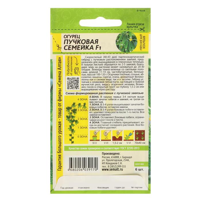 Скороспелый (40-43 дня) партенокарпический гибрид с пучковым расположением завязей, предназначен для выращивания в пленочных теплицах. В пазухах листьев образуется по 2-5 завязей, благодаря чему на растении может наливаться до 20-30 плодов Зеленцы темно-зеленые со светлыми полосами, длиной 11-14 см, частобугорчатые, белошипые, массой 100-120 г. Огурчики плотные, сочные, сладкие, абсолютно лишены горечи, очень ароматные – настоящее лакомство для детей и взрослых! Великолепны как в свежем виде, так и не теряют своих вкусовых качеств при засолки и консервировании. Гибрид устойчив к оливковой пятнистости, настоящей и ложной мучнистой росе, вирусу огуречной мозаики. Возможен посев в открытый грунт на глубину 1,5-2 см или выращивание через рассаду. Схема формирования растения с пучковой завязью: 0 ЗОНА. В пазухах первых 3-4 листьев выщипывают зачатки побегов и завязей, не трогая самих листьев. 1 ЗОНА. В 3-4 узлах выщипывают зачатки боковых побегов, оставляя завязи. 2 ЗОНА. В 3-4 узлах боковые побеги оставляют, удаляют точку роста после 1-го листа. Все завязи оставляют. 3 ЗОНА. Оставляют боковые побеги, ограничивая их рост после 2 листа. 4 ЗОНА. Главный стебель прищипывают, когда он достигнет соседнего растения. Все боковые побеги удаляют.