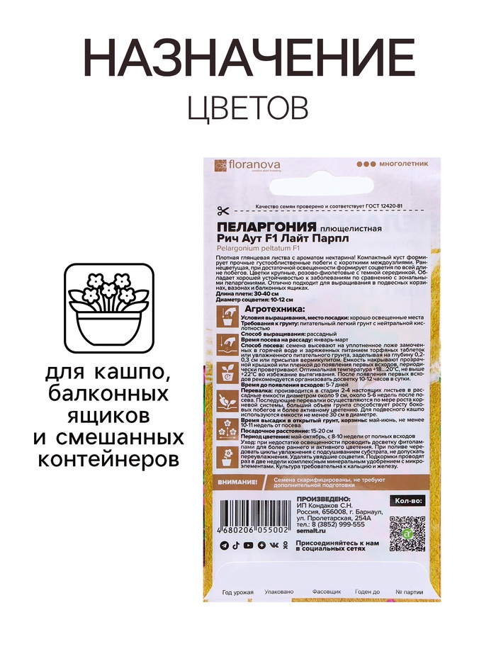 Сильно ветвящиеся побеги, образующие шаровидное растение диаметром 70-80 см. Непрерывное цветение постоянно возобновляющимися цветками. Короткие прочные цветоносы. Использование – подвесные кашпо, балконные ящики, смешанные контейнеры. Рекомендуется выращивать на хорошо освещенном месте. Совершенно новая ампельная пеларгония профессионального уровня, выращиваемая из семян. Легкое в выращивании, благодаря своей компактной форме и коротким междоузлиям. Не образует рыхлого растения с длинными хрупкими побегами, а формирует без обрезки очень плотный куст шаровидной формы. Обладает жесткими листьями и прочными побегами – что делает растение устойчивым к ветру и дождям. Цветение очень обильное – сотни постоянно возобновляющихся цветков.