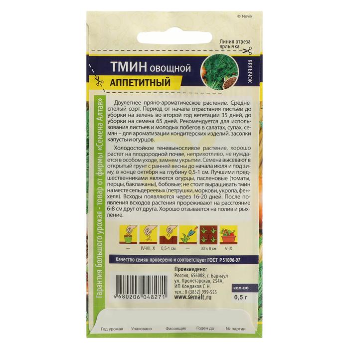 Двулетнее пряно-ароматическое растение. Среднеспелый сорт. Период от начала отрастания листьев до уборки на зелень во второй год вегетации 35 дней, до уборки на семена 65 дней. Рекомендуется для использования листьев и молодых побегов в салатах, супах, семян – для ароматизации кондитерских изделий, засолки капусты и огурцов. Холодостойкое теневыносливое растение, хорошо растет на плодородной почве, неприхотливо, не нуждается в особом уходе зимнем укрытии. Семена высевают в открытый грунт с ранней весны до начала июля и под зиму, в конце октября на глубину 0,5-1 см. Лучшими предшественниками являются огурцы, пасленовые (томаты, перцы, баклажаны), бобовые; не стоит выращивать тмин на месте сельдереевых (петрушки, моркови, укропа, фенхеля). Всходы появляются через 16-20 дней. После появления всходов растения прореживают на расстояние 6-8 см друг от друга. Хорошо отзывается на полив и рыхление.