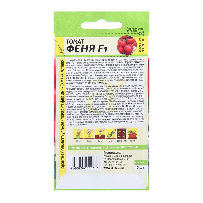 В марте семена высевают на слегка утрамбованный грунт, мульчируют торфом или почвенным слоем 1 см, поливают теплой водой через ситечко, накрывают пленкой и ставят в теплое (около 25°С) место. После появления всходов пленку снимают, рассаду размещают в светлом месте. В течение 5-7 суток температуру поддерживают на уровне 15-16°С, затем повышают до 20-22°С. В фазе 1-2 настоящих листьев рассаду пикируют. 60-65-дневную рассаду в фазе 6-7 настоящих листьев высаживают в защищенный или открытый грунт с соблюдением посадочного расстояния 40х40 см. Детерминантные томаты в открытом грунте формируют в 1-2 стебля, в теплице – в 3-4 стебля. Томаты хорошо отзываются на редкий, но обильный полив. При выращивании в теплице рекомендованы магниевые подкормки по вегетации. В период налива плодов рекомендуется произвести калийную подкормку. Урожай собирают в течение сезона по мере созревания. Недозревшие плоды могут дозариваться не на растении.