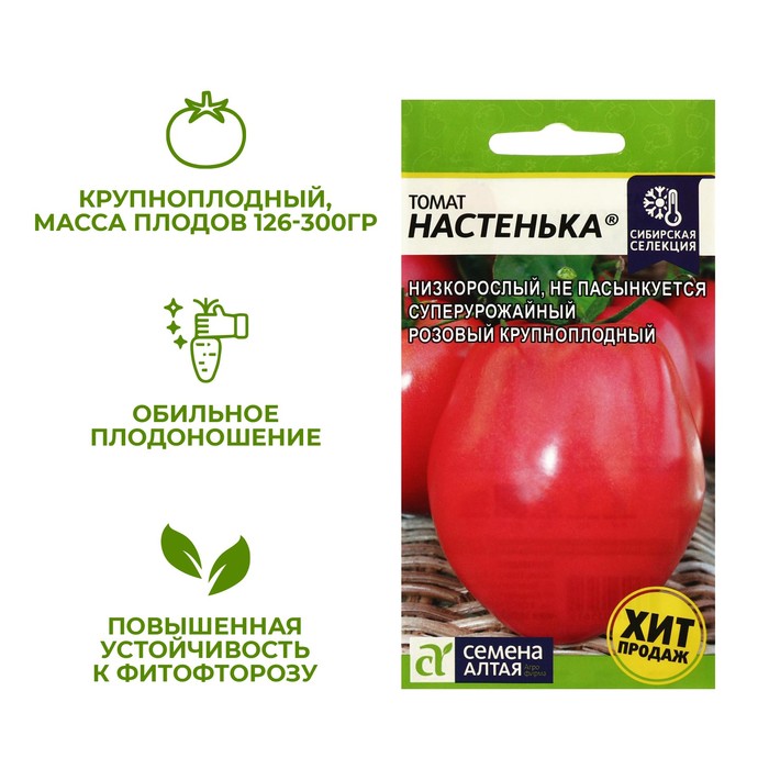 Селекция Агрофирмы «Семена Алтая». Среднеспелый сорт, куст компактный, высотой до 70 см. Не требуется пасынкования. Плоды округло-вытянутые, розовые, мясистые, очень вкусные, массой 126 г, отдельные плоды до 500 г. Сорт отличается обильным плодоношением в любых погодных условиях и повышенной устойчивостью к фитофторозу.