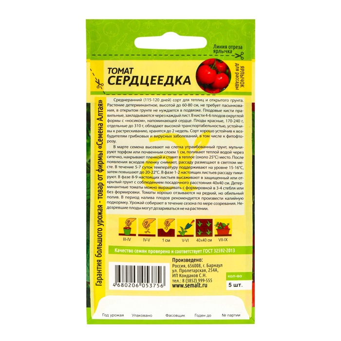 Среднеранний (115-120 дней) сорт для теплиц и открытого грунта. Растение детерминантное, высотой до 60-80 см, не требует пасынкования, в открытом грунте не нуждается в подвязке. Плодовые кисти правильные, закладываются через каждый лист. В кисти 4-6 плодов округлой формы с «носиком», напоминающей сердце. Плоды красные, 170-240 г, отдельные до 310 г, обладают высокой транспортабельностью, устойчивы к растрескиванию, хранятся до 2 недель. Сорт хорошо устойчив к возбудителям грибковых и вирусных заболеваний, в том числе к фитофторозу. В марте семена высевают на слегка утрамбованный грунт, мульчируют торфом или почвенным слоем 1 см, поливают теплой водой через ситечко, накрывают пленкой и ставят в теплое (около 25°С) место. После появления всходов пленку снимают, рассаду размещают в светлом месте. В течение 5-7 суток температуру поддерживают на уровне 15-16°С, затем повышают до 20-22°С. В фазе 1-2 настоящих листьев рассаду пикируют. 60-65-дневную рассаду в фазе 6-7 настоящих листьев и хотя бы одной цветочной кисти высаживают в защищенный или открытый грунт с соблюдением посадочного расстояния 40х40 см. Детерминантные томаты в открытом грунте формируют в 1-2 стебля, в теплице – в 3-4 стебля. Томаты хорошо отзываются на редкий, но обильный полив. При выращивании в теплице рекомендованы магниевые подкормки по вегетации. В период налива плодов рекомендуется произвести калийную подкормку. Урожай собирают в течение сезона по мере созревания. Недозревшие плоды могут дозариваться не на растении.