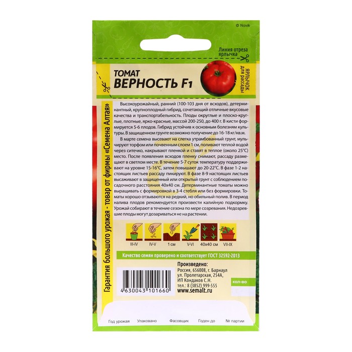 В марте семена высевают на слегка утрамбованный грунт, мульчируют торфом или почвенным слоем 1 см, поливают теплой водой через ситечко, накрывают пленкой и ставят в теплое (около 25°С) место. После появления всходов пленку снимают, рассаду размещают в светлом месте. В течение 5-7 суток температуру поддерживают на уровне 15-16°С, затем повышают до 20-22°С. В фазе 1-2 настоящих листьев рассаду пикируют. 60-65-дневную рассаду в фазе 6-7 настоящих листьев и хотя бы одной цветочной кисти высаживают в защищенный или открытый грунт с соблюдением посадочного расстояния 40х40 см. Детерминантные томаты в открытом грунте формируют в 1-2 стебля, в теплице – в 3-4 стебля. Томаты хорошо отзываются на редкий, но обильный полив. При выращивании в теплице рекомендованы магниевые подкормки по вегетации. В период налива плодов рекомендуется произвести калийную подкормку. Урожай собирают в течение сезона по мере созревания. Недозревшие плоды могут дозариваться не на растении.