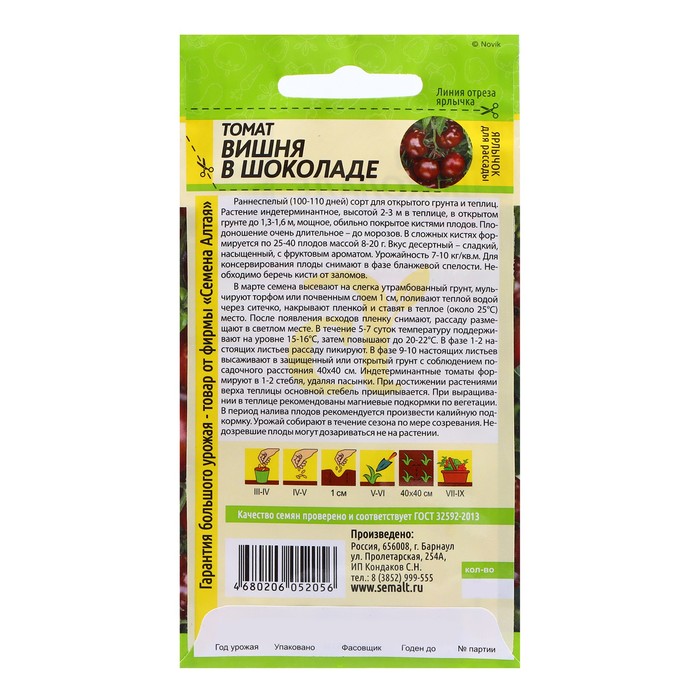 Раннеспелый (100-110 дней) сорт для открытого грунта и теплиц. Растение индетерминантное, высотой 2-3 м в теплице, в открытом грунте до 1,3-1,6 м, мощное, обильно покрытое кистями плодов. Плодоношение очень длительное – до морозов. В сложных кистях формируется по 25-40 плодов массой 8-20 г. Вкус десертный – сладкий, насыщенный, с фруктовым ароматом. Урожайность 7-10 кг/кв.м. Для консервирования плоды снимают в фазе бланжевой спелости. Необходимо беречь кисти от заломов. В марте семена высевают на слегка утрамбованный грунт, мульчируют торфом или почвенным слоем 1 см, поливают теплой водой через ситечко, накрывают пленкой и ставят в теплое (около 25°С) место. После появления всходов пленку снимают, рассаду размещают в светлом месте. В течение 5-7 суток температуру поддерживают на уровне 15-16°С, затем повышают до 20-22°С. В фазе 1-2 настоящих листьев рассаду пикируют. В фазе 9-10 настоящих листьев высаживают в защищенный или открытый грунт с соблюдением посадочного расстояния 40х40 см. Индетерминантные томаты формируют в 1-2 стебля, удаляя пасынки. При достижении растениями верха теплицы основной стебель прищипывается. При выращивании в теплице рекомендованы магниевые подкормки по вегетации. В период налива плодов рекомендуется произвести калийную подкормку. Урожай собирают в течение сезона по мере созревания. Недозревшие плоды могут дозариваться не на растении.