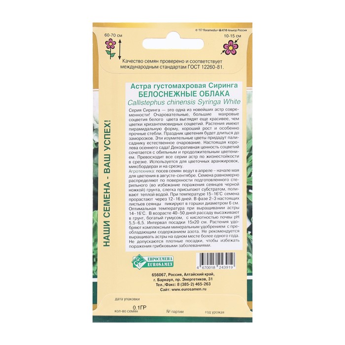 Семена цветов астра сиринга «Белоснежные Облака», 0.1 г