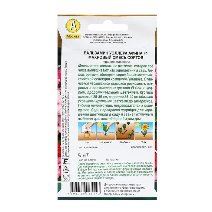 Семена цветов Бальзамин "Афина" F1 махровый, смесь сортов, ц/п, 5 шт