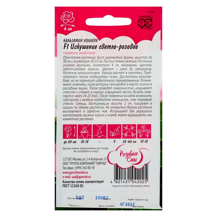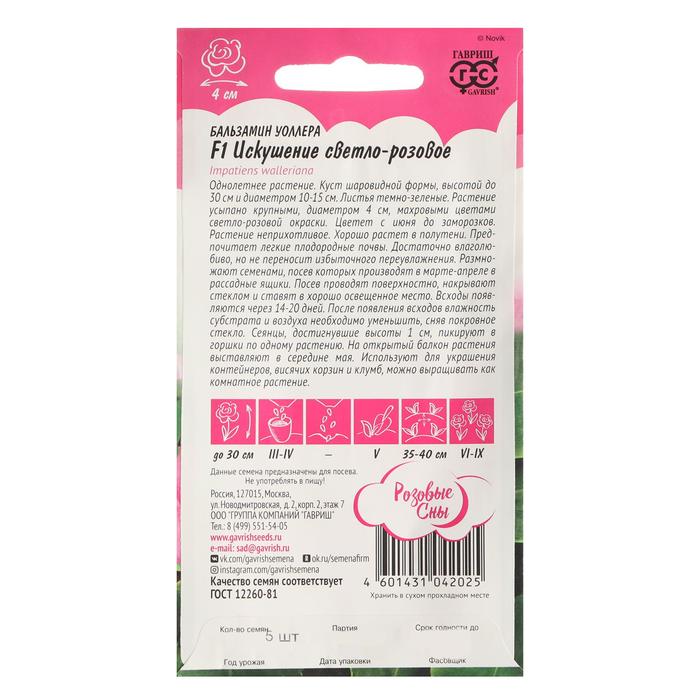Семена цветов Бальзамин Уоллера "Искушение светло-розовое" F1, О, ц/п, 4 шт.