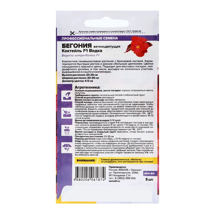 Семена цветов Бегония Коктейль F1 Водка вечноцветущая, ц/п, 5 шт.