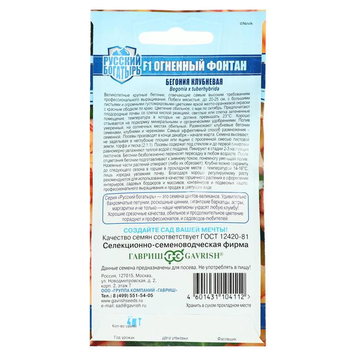 Семена цветов Бегония "Огненный фонтан", ц/п, F1, серия Русский богатырь, гранулы, 4 шт