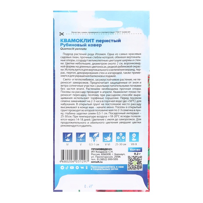 Семена цветов Квамоклит "Рубиновый ковер", перистый, Сем. Алт, ц/п, 0,2 г