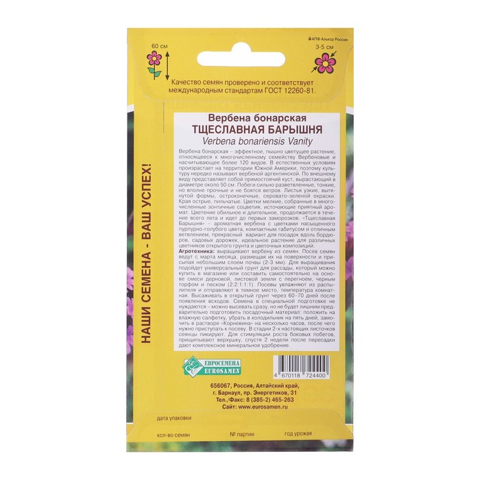 Семена цветов Семена цветов Вербена бонарская «Тщеславная Барышня», однолетник, 5 шт.