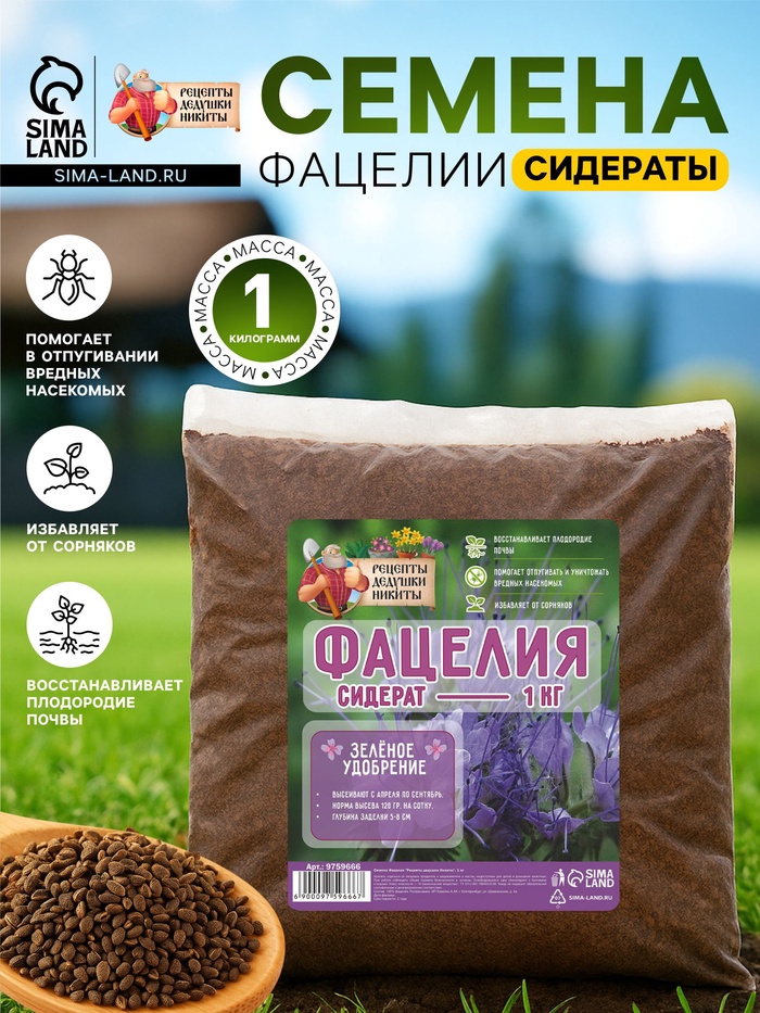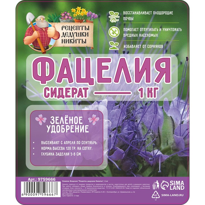 Универсальный вариант для огорода в любом регионе, этот сидерат улучшает почву по ряду показателей, а культивировать его очень просто.Виды применения:1) Медонос. Сбор меда с гектара посадки составляет 200 кг, на плодородных почвах – 300 кг. Даже несколько кустиков привлекут достаточно много насекомых-опылителей на участок.2) Корм скоту и птице. Польза фацелии в рационе животных в первую очередь связана с ее бактерицидными свойствами. Кроме того, это питательная зелень, которая не содержит никаких вредных веществ.3) Инсектицид. Растение отпугивает многих вредителей – нематод, тлей, проволочников, долгоносиков, саранчу и зерновку гороховую. А также приманивает хищных насекомых, питающихся цветоедами, листовертками, плодожорками.4) Фунгицид. На корнях фацелий живут бактерии, продуцирующие природные антибиотики. Поэтому овощи, растущие на участке после сидерата, не подвержены фитофторозу, гнилям и другим грибковым болезням. Преимущество фацелии в том, что она не состоит в родстве с овощными, злаковыми, ягодными, плодовыми культурами и не страдает ни одной огородной болезнью. Поэтому сеять сидерат можно после любых растений.Особенности: фацелия отличается редкой неприхотливостью.Морозостойкость: сидерат выдерживает похолодание до - 9°C, даже для молодых всходов безопасны заморозки до - 5°C.Засухоустойчивость: культура засухоустойчива, хорошо растет не только в залитых солнцем местах, но и в тени.Норма высева: 200 г семян на 100 кв. м. (на сотку).