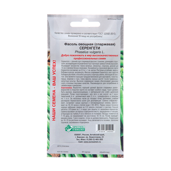 Семена Фасоль овощная, спаржевая Серенгети, 15 шт