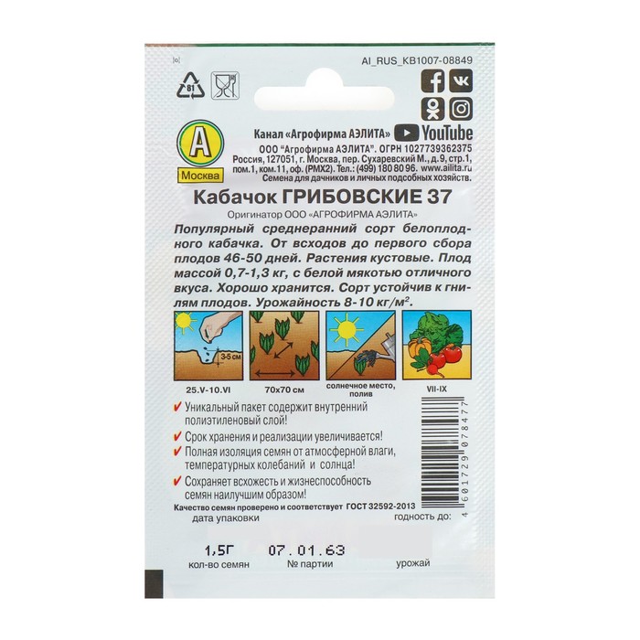 Семена Кабачок белоплодный "Грибовские 37" "Лидер", 8 шт.