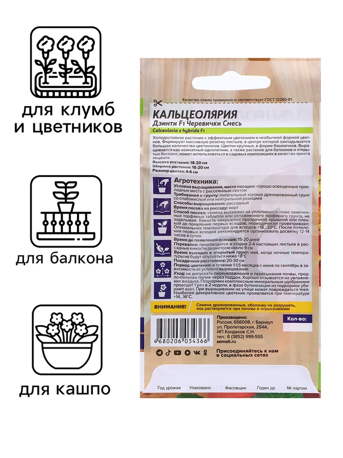 Семена Кальцеолярия "Дэинти", ц/п, F1, 3 шт