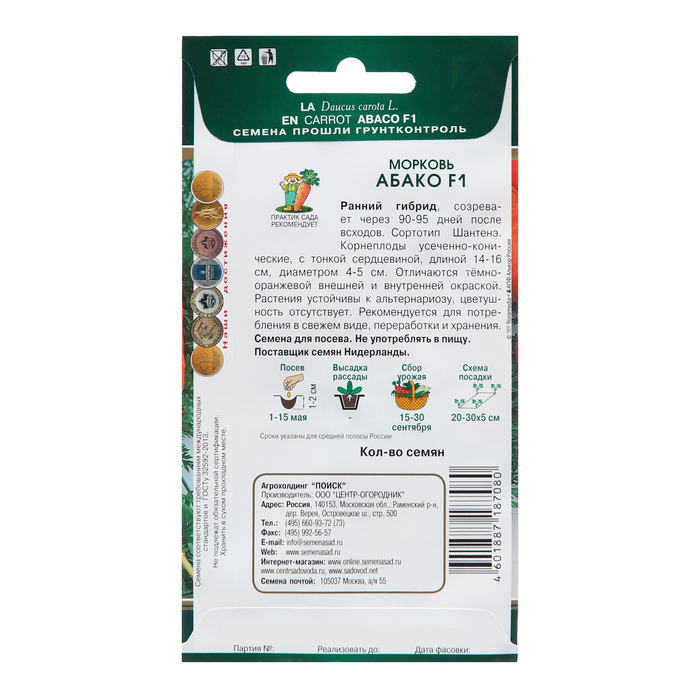 Морковь Абако F1 - раннеспелость и непревзойдённые товарные качества. Ранний гибрид, созревает через 90-95 дней после всходов. Сортотип Шантенэ. Корнеплоды усечено-конические, с тонкой сердцевиной, длиной 14-16 см, диаметром 4-5 см. Отличаются тёмно-оранжевой внешней и внутренней окраской. Растения устойчивы к альтернариозу, цветушность отсутствует. Рекомендуется для потребления в свежем виде, переработки и хранения.