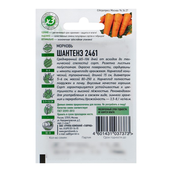 Среднеранний (105-115 дней от всходов до технической спелости) сорт. Посев семян в грунт производится в конце апреля – начале мая на глубину 1 см, расстояние между рядками 15 см. Подросшие всходы прореживают, оставляя между растениями по 5-7 см. Розетка листьев полустоячая. Окраска поверхности, сердцевины и мякоти корнеплода – оранжевая. Корнеплод конический, тупоконечный, длиной 15 см, диаметром 5-6 см, массой 80-250г. Корнеплод полностью погружен в почву. Вкусовые качества высокие. Сорт характеризуется устойчивостью к цветушности. Рекомендован для потребления в свежем виде и переработки. Урожайность 2,0-4,0 кг/м2.