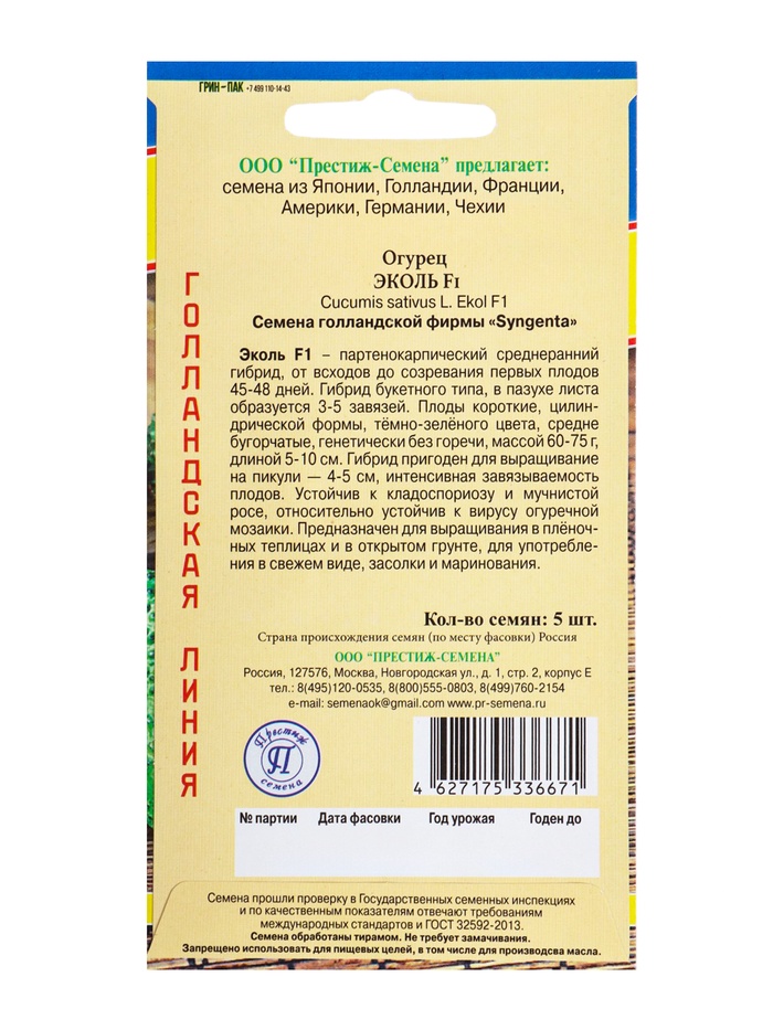 Семена Огурец «Эколь» F1, раннеспелый, партенокарпический, 5 шт.