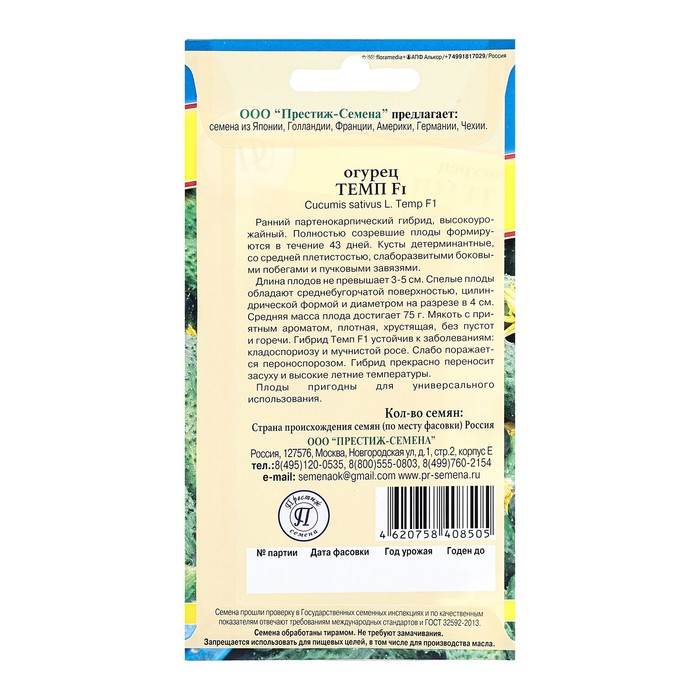 Ранний партенокарпический гибрид, высокоурожайной. Полностью созревшие плоды формируются в течение 43 дней. Кусты детерминантные, со средней плетистостью, слаборазвитыми боковыми побегами и пучковыми завязями.Длина плодов не превышает 3-5 см. Спелые плоды обладают среднебугорчатой поверхностью, цилиндрической формой и диаметром на разрезе в 4 см. Средняя масса плода достигает 75 г. Мякоть с приятным ароматом, плотная, хрустящая, без пустот и горечи. Гибрид Темп F1 устойчив к заболеваниям: кладоспориозу и мучнистой росе. Слабо поражается пероноспорозом. Гибрид прекрасно переносит засуху и высокие летние температуры.Плоды пригодны для универсального использования.Семена обработаны Тирамом. Не требуют замачивания.