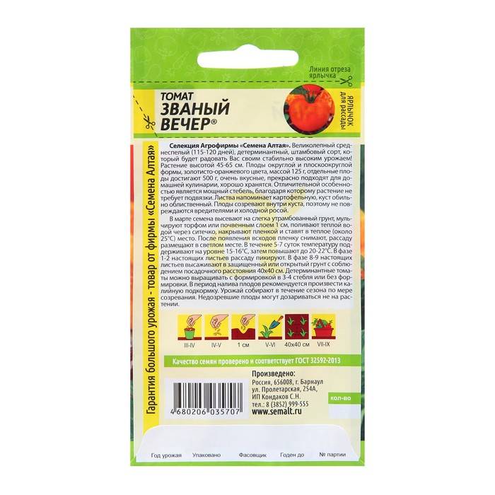 Семена Томат "Званый Вечер", среднеспелый, цп,детерминантный, низкорослый, 0,05 г.