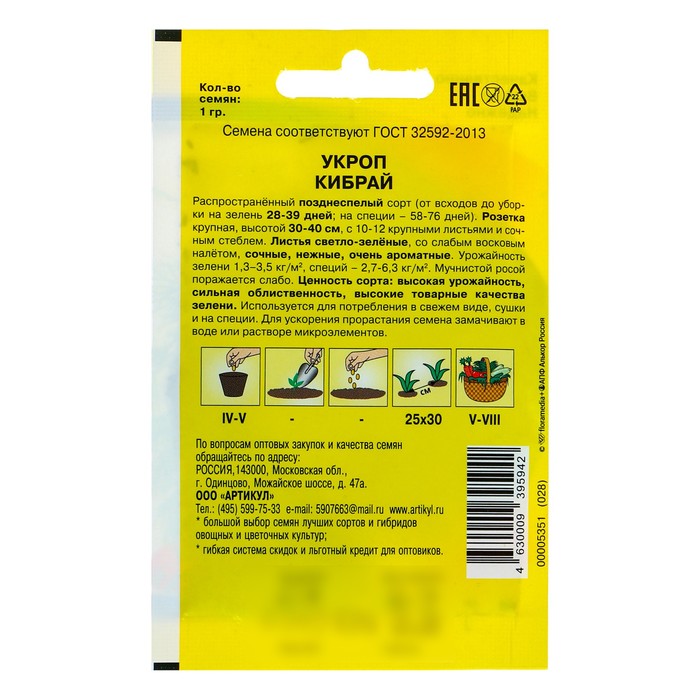 Семена Укроп "Кибрай" кустовой, позднеспелый, 1 г