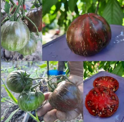 Один из самых красивых сортов.Высота 1,4 м. среднеранний.очень интересный и вкусный сорт. Растения имеют тонкие листья и тонкие побеги. из них получаются идеальные помидоры темно-коричневого / фиолетового цвета сердцевидной формы с оливковыми плечиками.Масса плодов 100-250 гр.
