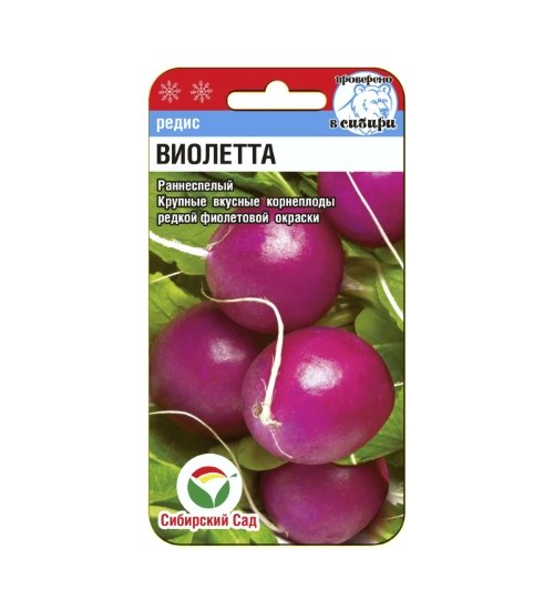 Раннеспелый сорт редиса с необычной фиолетовой окраской. Корнеплод округлый, диаметром 3 см. Вкусовые качества очень высокие, мякоть белая, хрустящая, сочная, мало острая. Рекомендуется для ранневесеннего посева. Устойчив к цветушности, не растрескивается и долго сохраняет товарные качества.